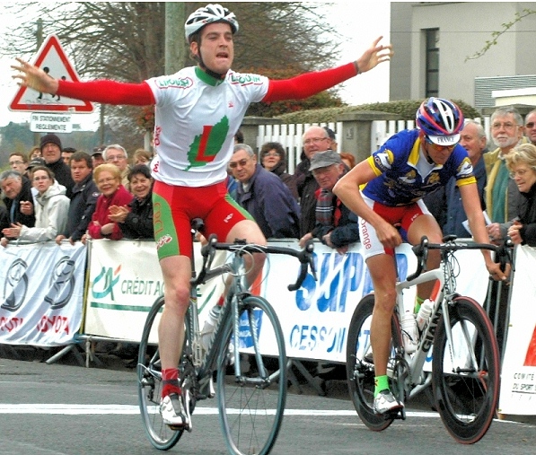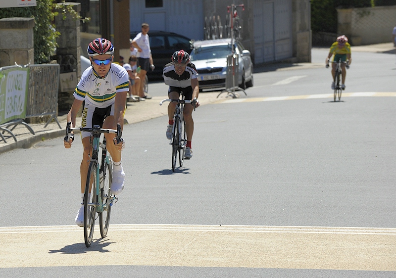 Le peloton se présenta donc groupé au moment d’affronter la dernière boucle de 30 kilomètres. Groupé, il ne le resta pas longtemps. Car, les grimpeurs Mederel, Luminet et Naibo secouèrent violemment le cocotier lors de l’ascension de Toulx-Sainte-Croix. On se retrouva alors avec des noix de coco disséminées partout sur le circuit ! Euh, pardon. On se retrouva alors avec de multiples coureurs lâchés. Il y en avait partout ! Huit hommes prirent finalement la poudre d’escampette : Gerbaud (Blois CAC41), Mederel (Auber 93), Naibo (US Montauban), Vachon (Bretagne Schuller), Brousse (Cycle Poitevin), Lutskovich (Team Primorskiy District), Edet (Team Veranda Sarthe) et Branquefort (Top 16). Sept de trop, selon Vachon. Alors, le professionnel de Bretagne Schuller haussa le ton en compagnie de Lutskovich. Derrière, cela se regarda en chiens de faïence. Vachon et Lutskovich en profitèrent. Ils continuèrent leur bonhomme de chemin jusqu’à l’arrivée. Et, sans surprise, le « pro » décramponna son partenaire de fugue lors du dernier kilomètre.