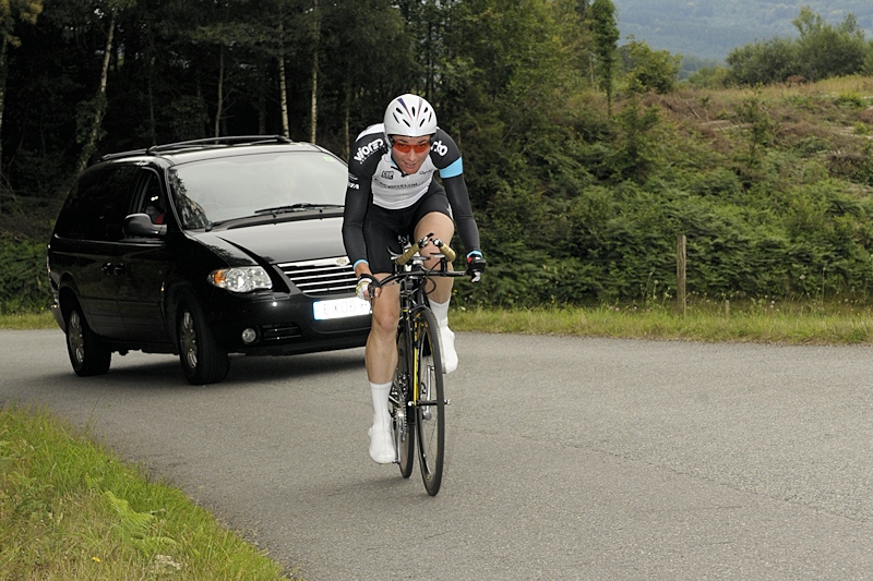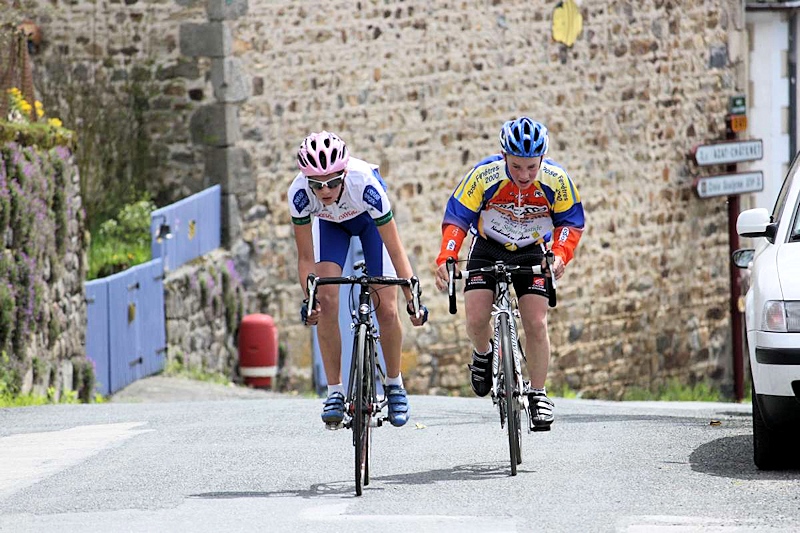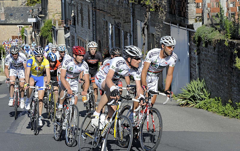 Aprrès le passage de Lanouaille, les coureurs s'acheminent vers les diffciles côtes de Charoncle (8.6 % de moyenne) et de Pervendoux (6.2 % de moyenne). C'est Gilles DEVILLIIERS qui engrange les points de la montagne et passe seul en tête à Chervais-Cubas avec une avance inférieure à 20". Le peloton est annoncé à 5'45" de la tête de course. Pas le temps de contempler le magnifique château de Hautefort et les coureurs sont désormais neuf en tête. Après les parties roulantes qui nous mènent vers Tutoirac, un petit détour vers le Col de Grange (5.2 % de moyenne) permet aux échappés de creuser un peu plus l'écart avec le peloton. L'ardoisier annonce alors un écart supérieur à 7 minutes. Le peloton serait-il résigné ?