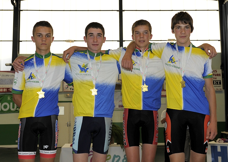 Dans la catégorie des 15/16 ans, la pression était forte pour Florian Milord (Haute-Vienne), champion sortant mais monté d'une catégorie d'âge. Un moment entre la 4ème et la 5ème place, il se dégageait finalement du petit groupe et la 2nde lui semblait promise lorsque sa chaîne se cassait... Plus d'un 1/2 tour le vélo sur l'épaule, impossible de faire autre chose que finir quand même après avoir changé de vélo (22). Malgré quelques petites erreurs l'ayant mis au tapis 4 fois, Maxime Dulau (Haute-Vienne) s'est battu, concentré et volontaire. 4ème pur UFOLEP et 9ème du scratch, il a beaucoup appris et sa course devrait le mettre en confiance pour l'avenir. Thomas Cluzeaud, après un départ malheureux, ne cessait de remonter au fil des tours. Bien appliqué, il décrochait une méritoire 17ème place qu'il est vraiment allé chercher. Sans le problème de chaîne, les 15/16 auraient dû monter sur le podium par équipes.