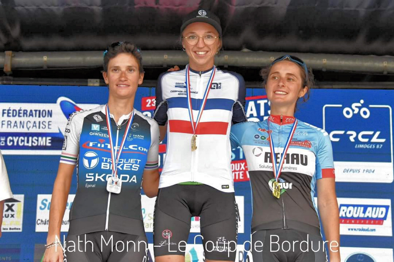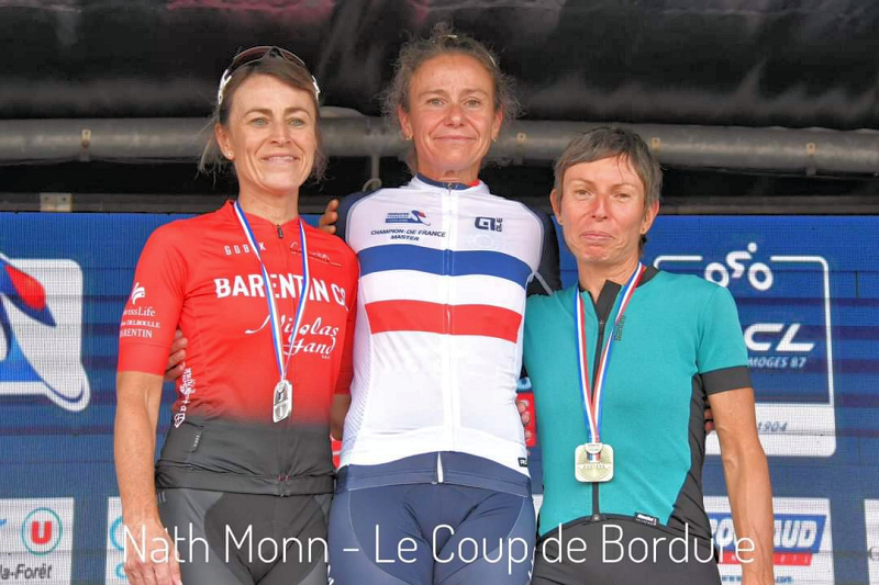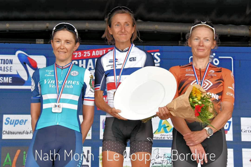 Dans la catégorie 50/54 ans, Sandrine LECOURT (CRCL) remporte la victoire à près de 34 km/h de moyenne et s'empare du maillot bleu, blanc, rouge de Championne de France Master. Au mois de juillet dernier, elle remportait également le titre national en Ufolep. Dans la catégorie 30/34 ans, Laura BONNIN (CC Bosmie) termine sur la troisième marche du podium. Déjà titrée en ufolep au niveau national aussi bien sur route qu'en cyclo-cross, elle monte donc à nouveau sur un podium national.
